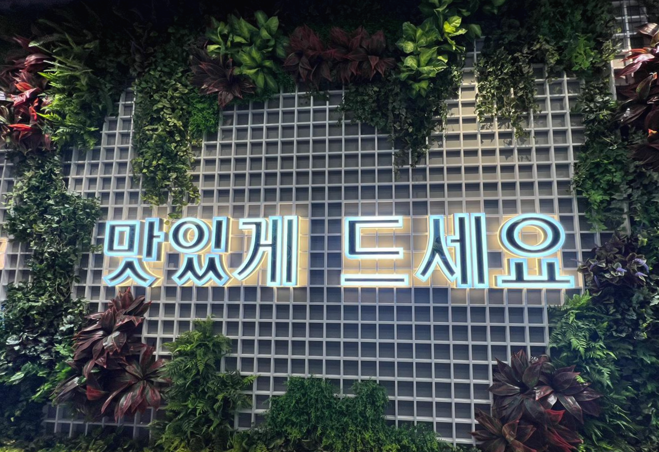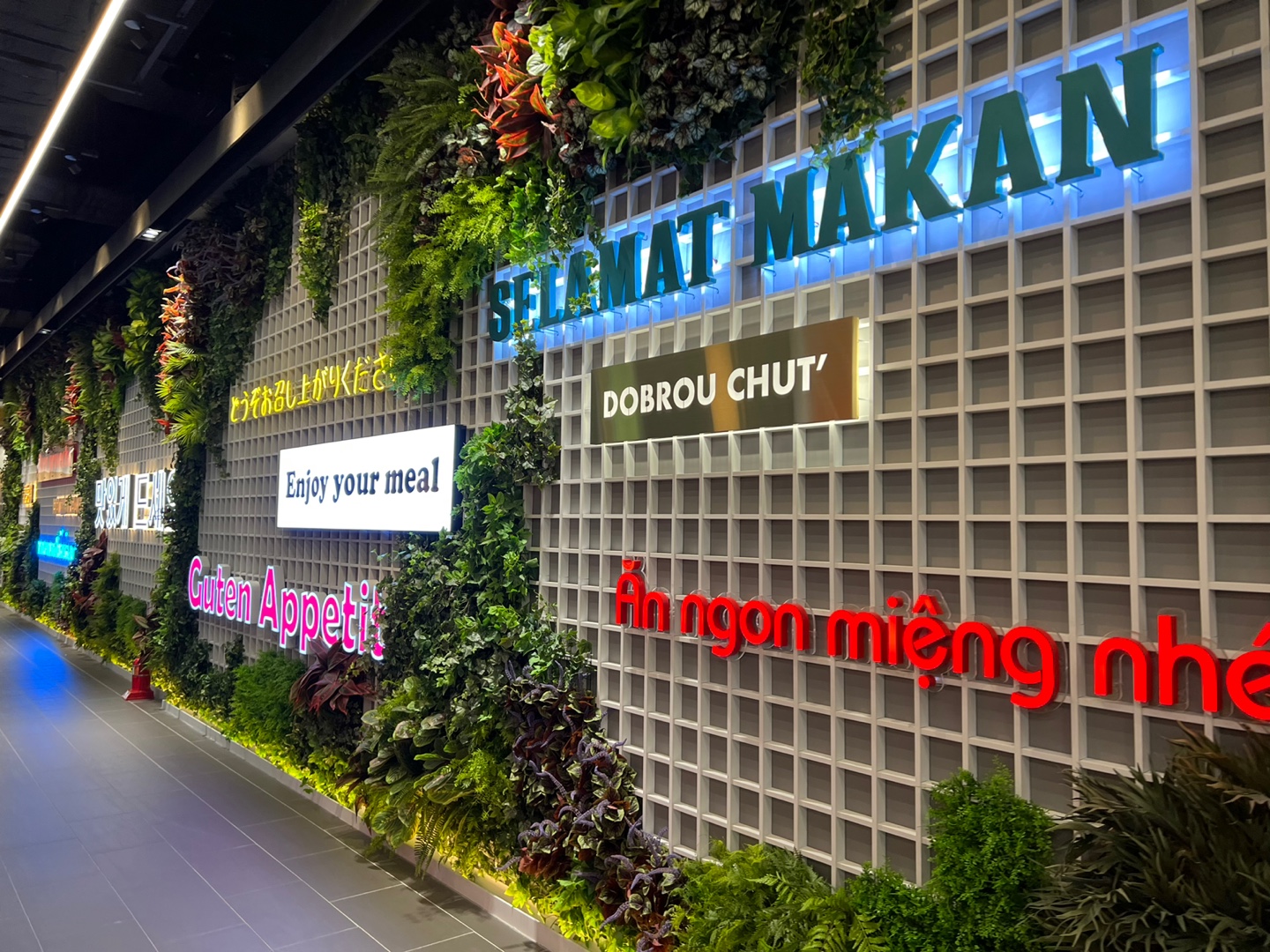 푸드코트 한쪽 벽면엔 이렇게 여러 언어로 된 '맛있게드세요' 단어가 쓰여 있다.