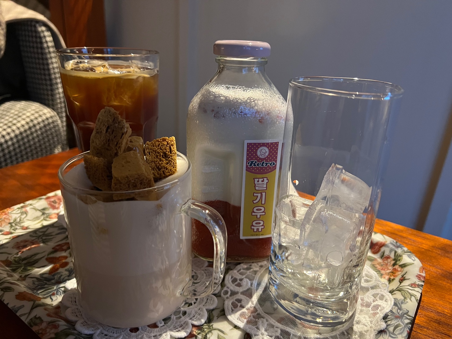 엄마가 썼던것같은 쟁반에 음료가 담겨져 왔다.