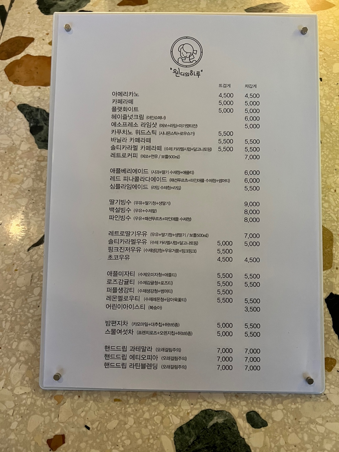 웬디의하루 메뉴판이다. 우리는 아이스 아메리카노, 레트로딸기우유, 솔티카라멜우유를 주문하였다.
