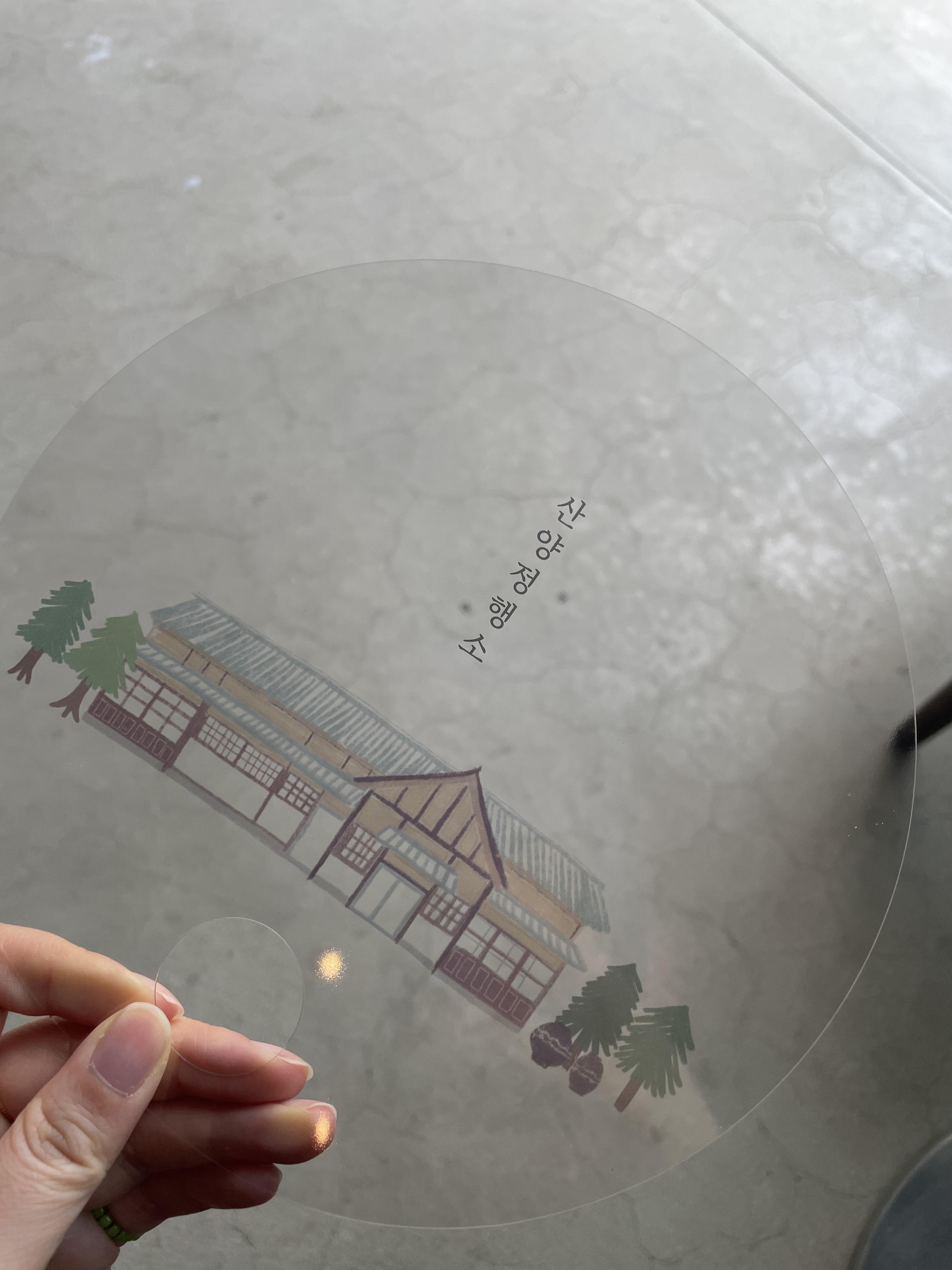 산양정행소에서는 만족도 조사를 하고 있는데 조사를 다 하고 직원에게 보여주면 카페 모습이 담긴 부채를 주고있었다.