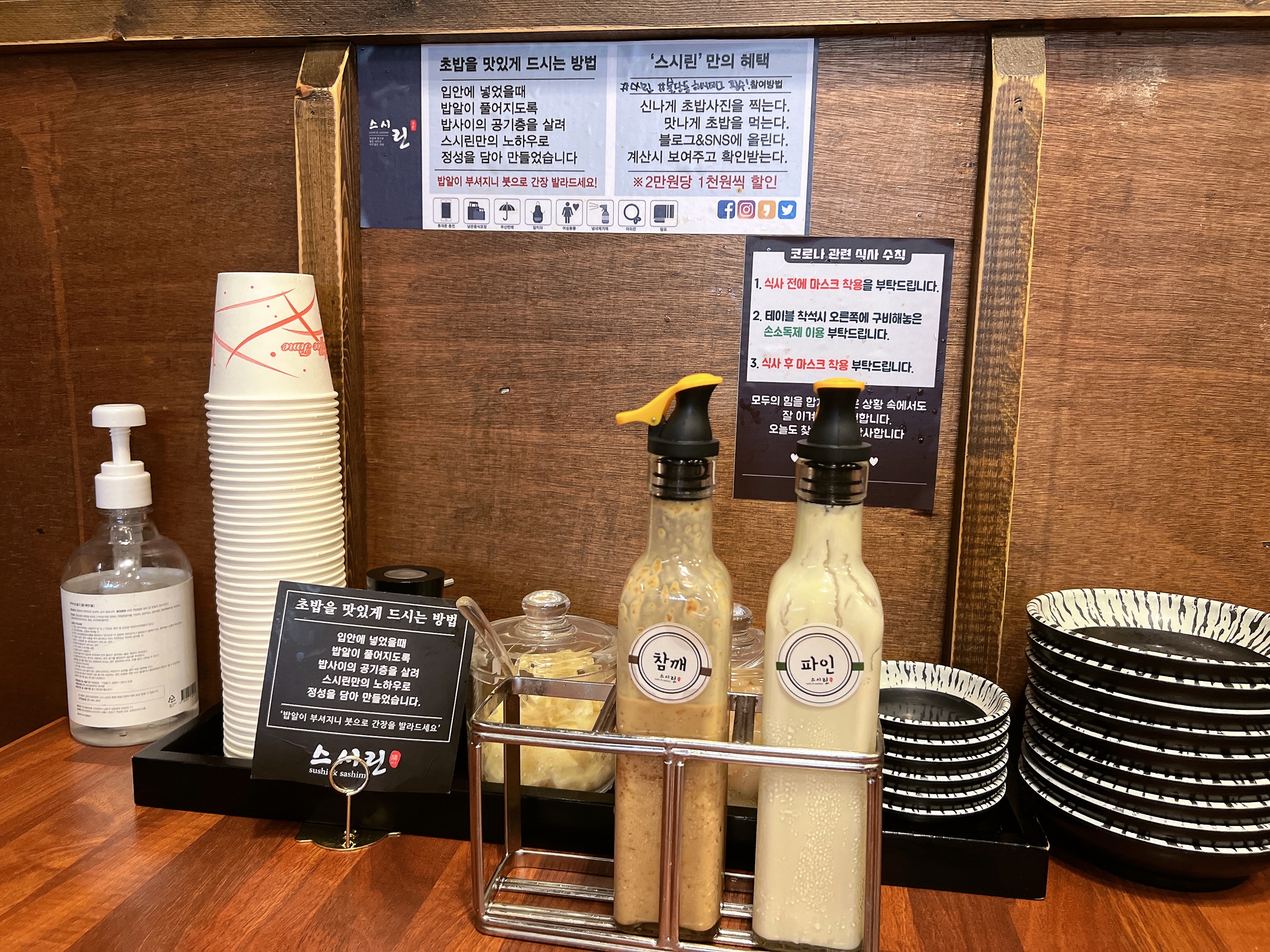 스시린대왕연어초밥을 시킬 때 양파소스를 얹을껀지, 간장소스를 얹을껀지 물어보는데 나는 반반으로 주문했다.