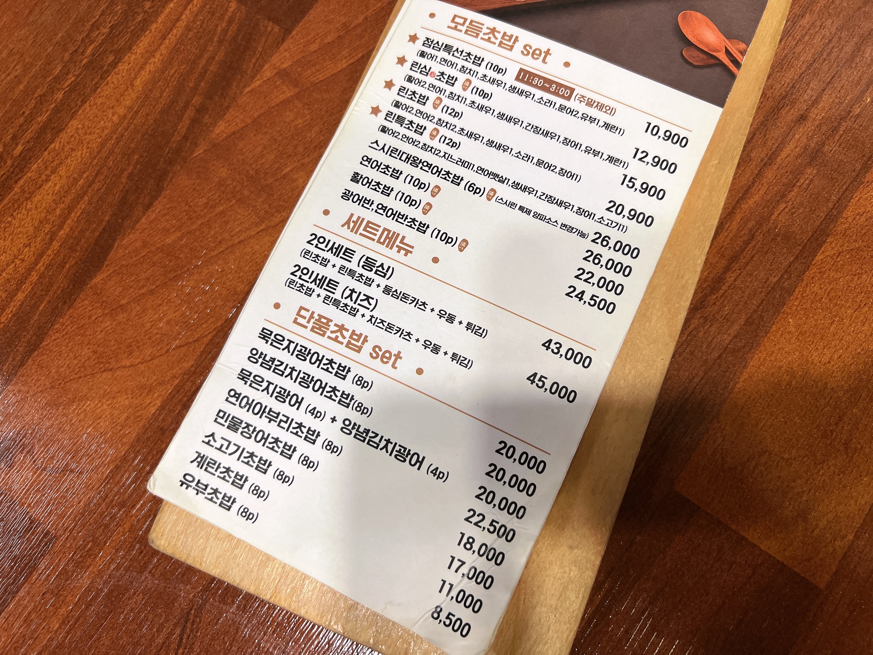 메뉴판이다! 우리는 린심초밥과 스시린대왕연어초밥을 시켰다.