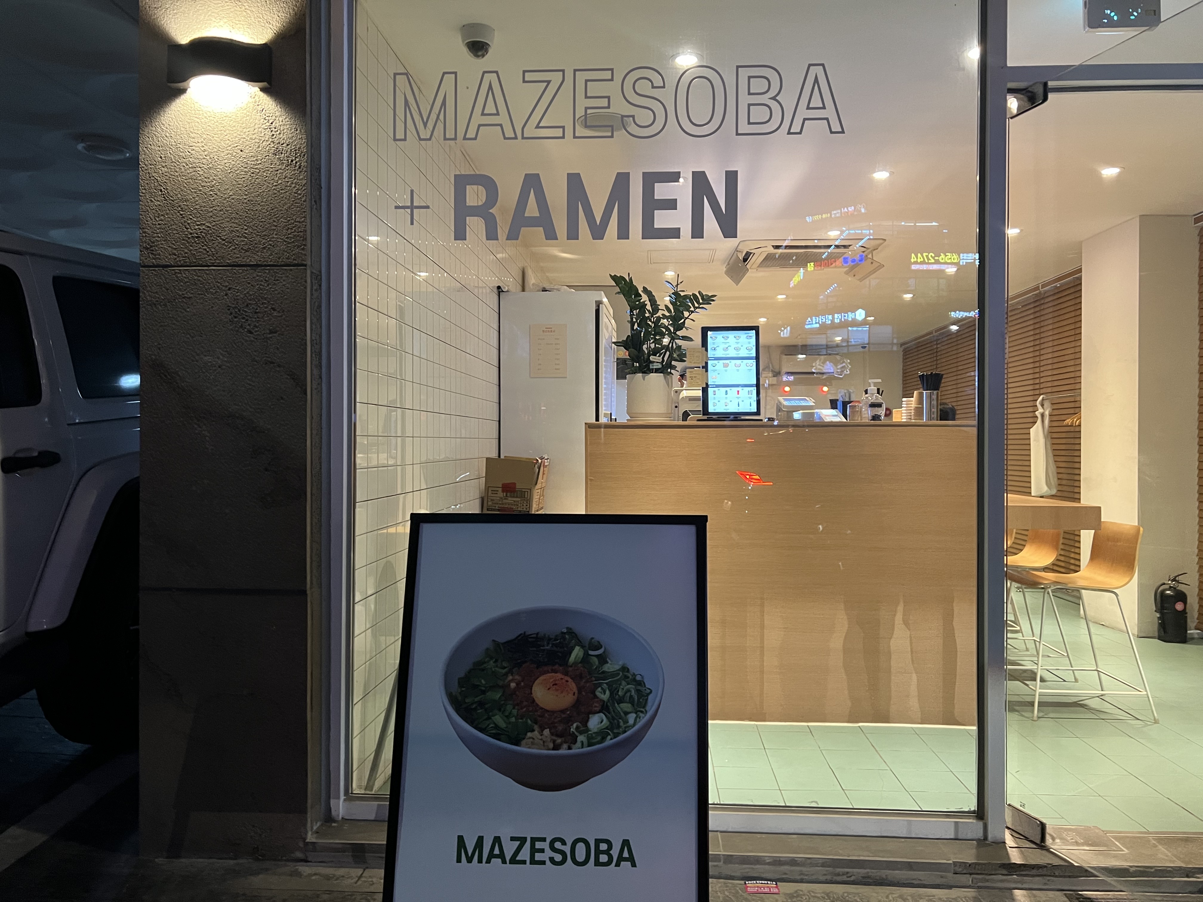 입간판엔 판코의 시그니처메뉴인 마제소바가 보인다!