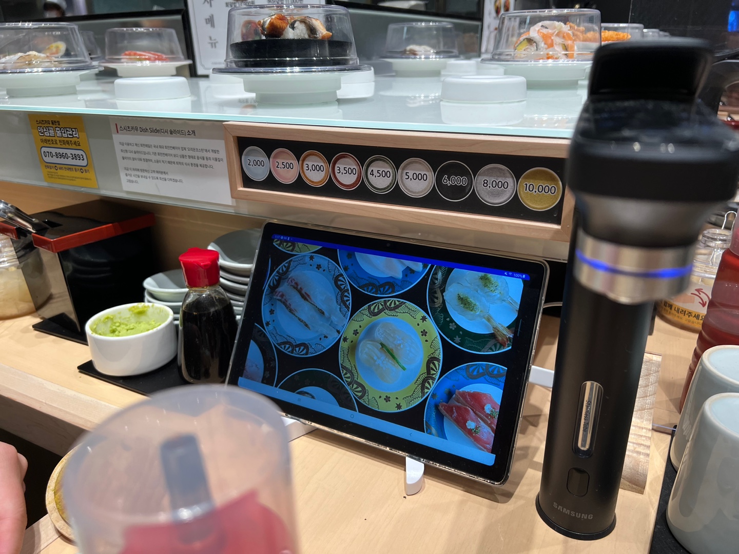 워낙에 회전초밥집을 좋아해서 다른 회전초밥집도 많이 갔지만 자리마다 삼성 정수기가 있는 회전초밥집은 처음이었다.